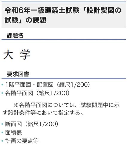 本日、一級建築士試験を運営している公益財団法人 建築技術教育普及センターから設計製図試験の課題が発表された。 今年の課題は… 大学! 全くの想定外 要求図書は1階平面図・配置図(縮尺1/200)各階平面図(縮尺1/200)、断面図(縮尺1/200)、面積表、計…